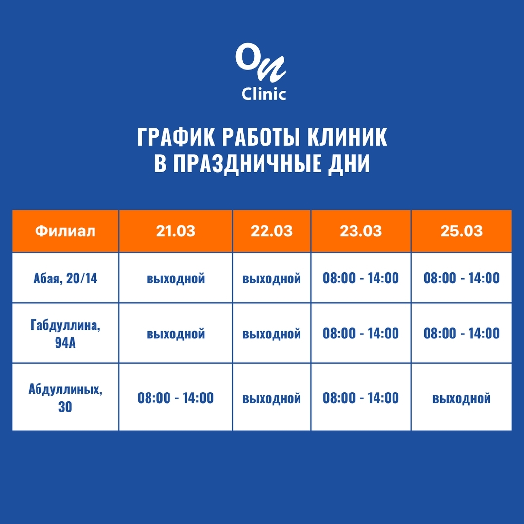 - 25 марта — рабочий день с 8:00 до 14:00 для клиник на Абая и Габдуллина
